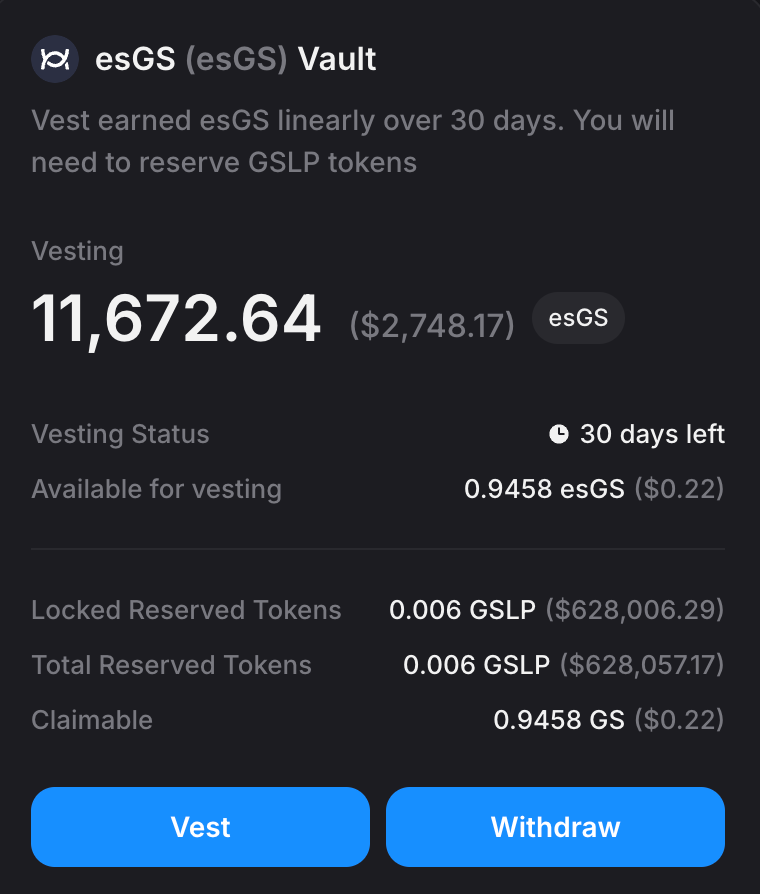 To convert the esGS to GS, you will have to vest the tokens over a 30 day period by reserving your LP tokens. The tokens are vested linearly and can be claimed at any time.