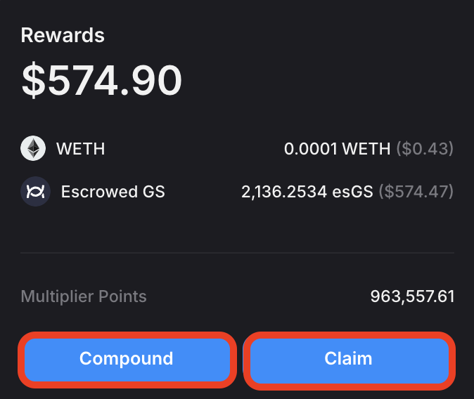 Claiming will transfer earned esGS rewards and ETH rewards to your wallet.